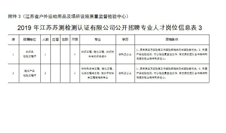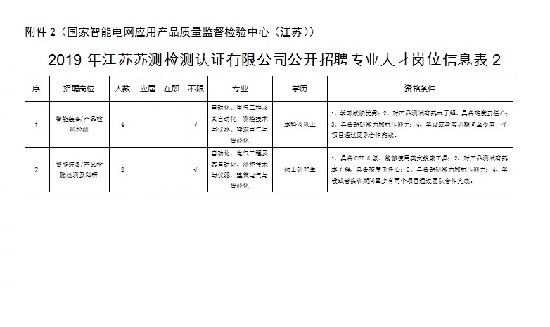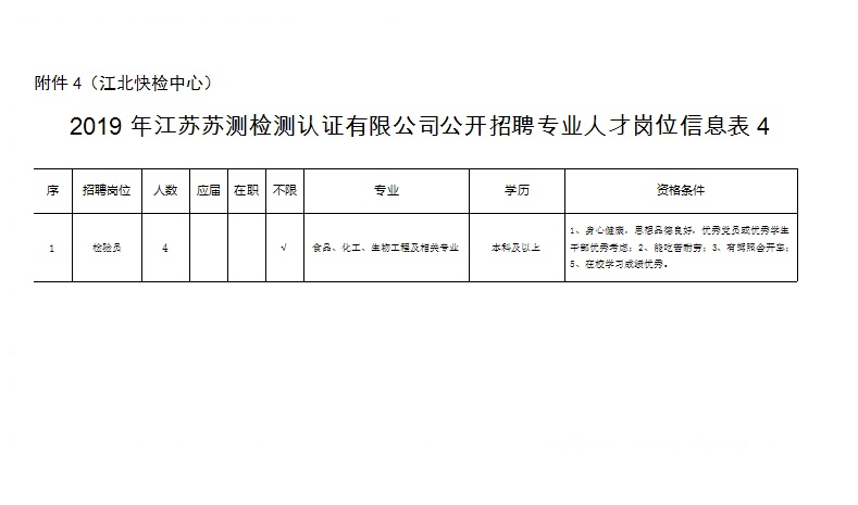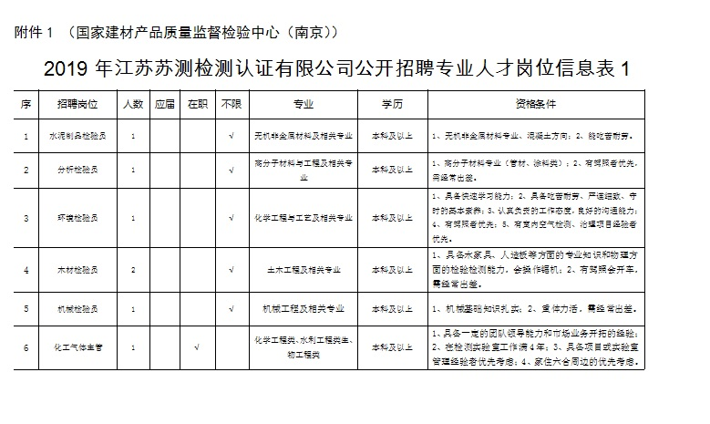根據(jù)工作需要,江蘇蘇測(cè)檢測(cè)認(rèn)證有限公司(南京市產(chǎn)品質(zhì)量監(jiān)督檢驗(yàn)院全資子公司)委托中智江蘇經(jīng)濟(jì)技術(shù)合作有限公司面向社會(huì)公開招聘24名《2019年江蘇蘇測(cè)檢測(cè)認(rèn)證有限公司公開招聘專業(yè)人才公告》崗位工作人員,工作地點(diǎn)覆蓋南京市,確定聘用后根據(jù)工作需要統(tǒng)一安排,現(xiàn)將有關(guān)事項(xiàng)公告如下: 一、招聘崗位及人數(shù) 江蘇蘇測(cè)檢測(cè)認(rèn)證有限公司包括水泥制品檢驗(yàn)員、分析檢驗(yàn)員、環(huán)境檢驗(yàn)員、木材檢驗(yàn)員、機(jī)械檢驗(yàn)員、化工氣體主管、化工氣體檢驗(yàn)員、智能裝備/產(chǎn)品檢驗(yàn)檢測(cè)、智能裝備/產(chǎn)品檢驗(yàn)檢測(cè)及科研、紡織品檢驗(yàn)工程師、輕工產(chǎn)品檢驗(yàn)工程師等崗位共招聘24人。 二、資格條件 1.具有中華人民共和國(guó)國(guó)籍,擁護(hù)黨的路線、方針、政策; 2.遵紀(jì)守法,品行端正,具有良好的職業(yè)道德; 3.無(wú)違法違紀(jì)行為,具備正常履行工作職責(zé)的身體條件; 4.具備崗位資格條件(詳見附件:《2019年江蘇蘇測(cè)檢測(cè)認(rèn)證有限公司公開招聘專業(yè)人才崗位信息表》) 三、簡(jiǎn)歷投遞方式 報(bào)名方式:本次招聘采取電子郵件報(bào)名方式。電子郵件報(bào)名時(shí),請(qǐng)將郵件主題及應(yīng)聘文檔按“2018年江蘇蘇測(cè)工作人員招聘材料+姓名+崗位”格式命名。 四、聘者需填寫個(gè)人簡(jiǎn)歷或者附件5-《2019年江蘇蘇測(cè)檢測(cè)認(rèn)證有限公司勞務(wù)外包項(xiàng)目報(bào)名表》,并提交求職材料。求職材料包含:(1)登記表或個(gè)人簡(jiǎn)歷上填寫內(nèi)容的證明材料(身份證、畢業(yè)證、學(xué)位證、職稱證、主要科研成果證明及獲獎(jiǎng)證書等材料原件掃描件/復(fù)印件);(2)有海外學(xué)習(xí)工作經(jīng)歷的需提供留學(xué)回國(guó)證明、學(xué)歷認(rèn)證等材料原件掃描件/復(fù)印件。(3)應(yīng)聘崗位所需提供的其他材料原件及復(fù)印件。 應(yīng)聘者請(qǐng)將個(gè)人簡(jiǎn)歷或者附件5-《2019年江蘇蘇測(cè)檢測(cè)認(rèn)證有限公司勞務(wù)外包項(xiàng)目報(bào)名表》及應(yīng)聘證明材料原件掃描并制作成一份PDF格式材料后,發(fā)送至郵箱:617025593@qq.com,相關(guān)咨詢電話:025-86673817 凌老師(工作日9:00-17:00,節(jié)假日除外)。 五、資格審查 1.初審。根據(jù)應(yīng)聘者提供的各種求職材料進(jìn)行資格審查,應(yīng)聘者提供的應(yīng)聘材料須真實(shí)準(zhǔn)確,一經(jīng)發(fā)現(xiàn)應(yīng)聘材料存在虛假不實(shí)之處,經(jīng)核實(shí),取消應(yīng)聘者應(yīng)聘資格,責(zé)任由應(yīng)聘人員自行承擔(dān)。 2.復(fù)審。現(xiàn)場(chǎng)對(duì)初審合格的應(yīng)聘者提供的各種求職材料原件進(jìn)行資格審查,交驗(yàn)證明材料原件。符合要求的準(zhǔn)許參加面試,不符合要求的取消其面試資格。 六、筆試、面試 符合資格審查的候選人,將統(tǒng)一組織開展筆試、面試,進(jìn)行擇優(yōu)選取。 七、體檢、錄用 根據(jù)崗位需要,經(jīng)考試、政審、體檢合格后確定聘用候選人。通過(guò)中智江蘇經(jīng)濟(jì)技術(shù)合作有限公司實(shí)行勞務(wù)外包管理。